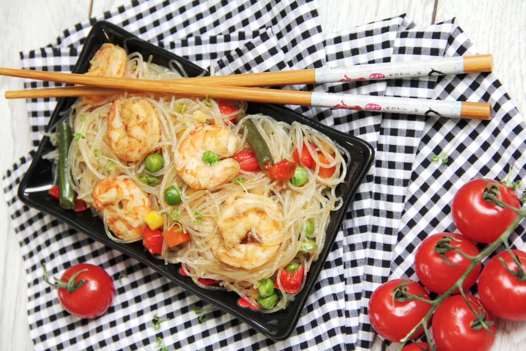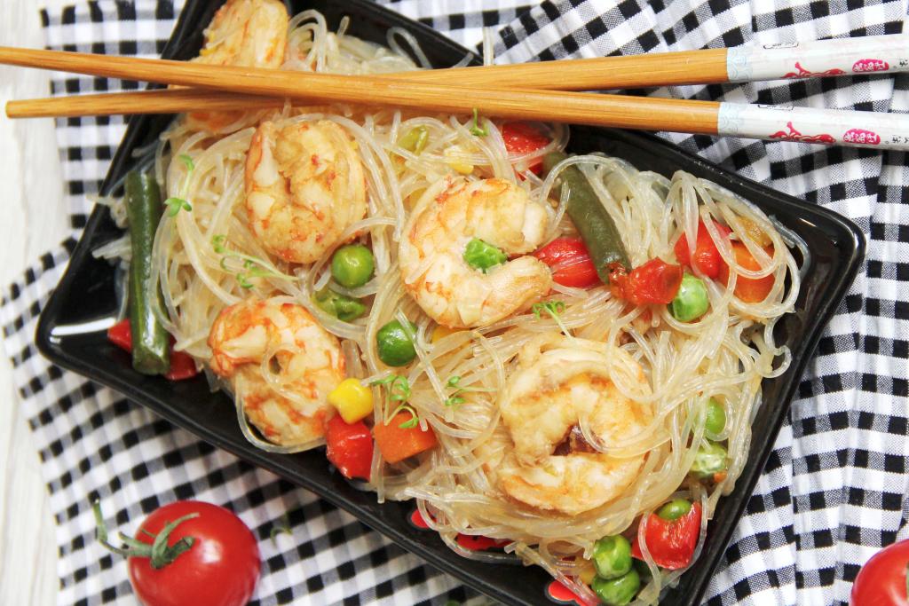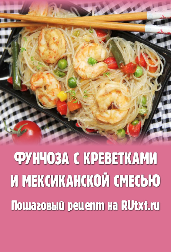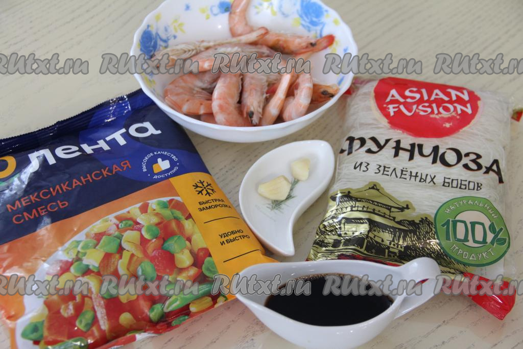 В нашей семье очень любят фунчозу, поэтому использую её для приготовления и холодных закусок, и блюд, которые лучше подавать горячими. В этот раз решила приготовить фунчозу с креветками и мексиканской овощной смесью. Замороженную мексиканскую овощную смесь можно купить практически в любом магазине. Блюдо получилось сытным, очень аппетитным и вкусным, его можно подать к столу и к обеду, и на ужин.