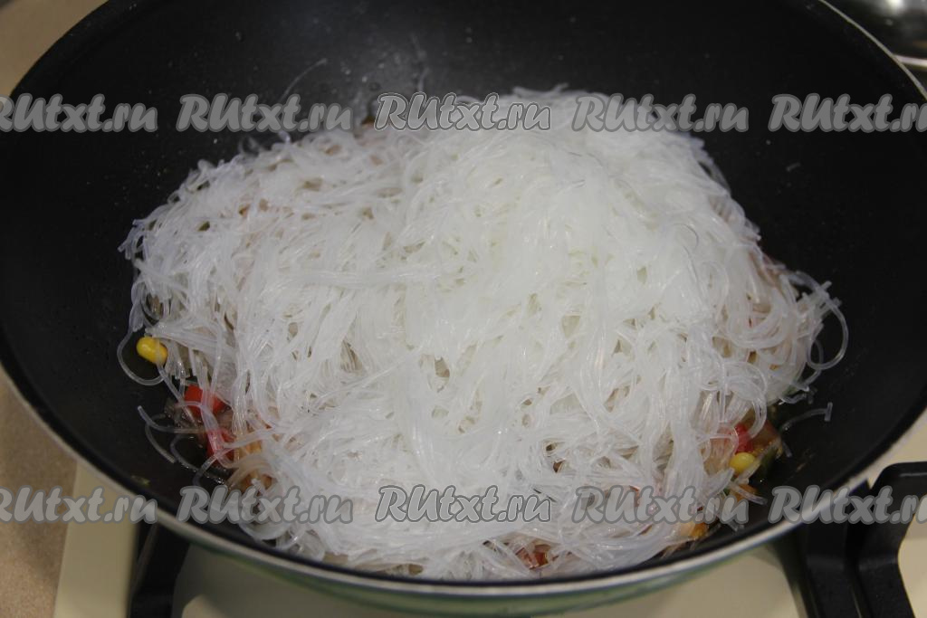 Добавить фунчозу в сковороду.