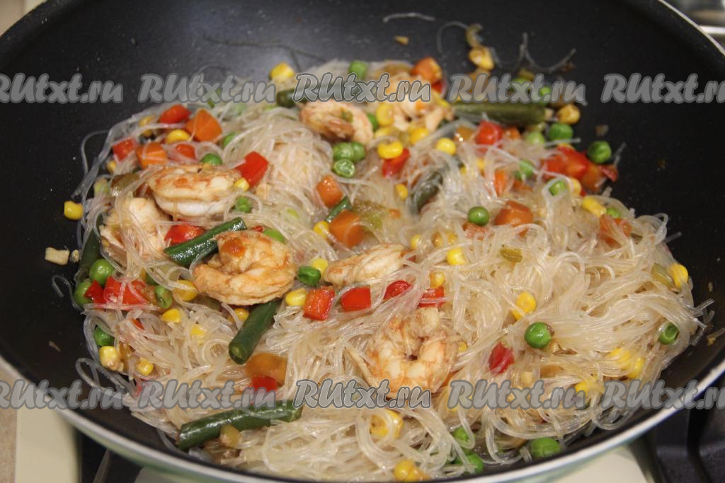 Перемешать фунчозу с овощами и креветками, прогреть на сковороде 2 минуты, периодически перемешивая.