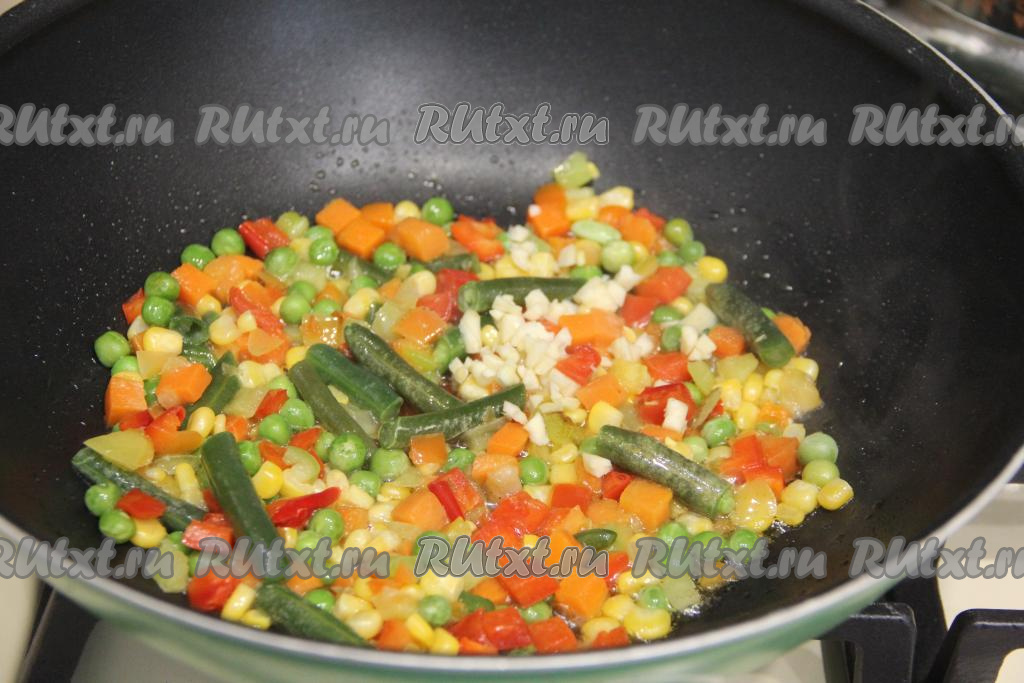 В сковороду добавить мелко нарезанный зубчик чеснока, перемешать и обжаривать овощи 2-3 минуты, иногда помешивая.