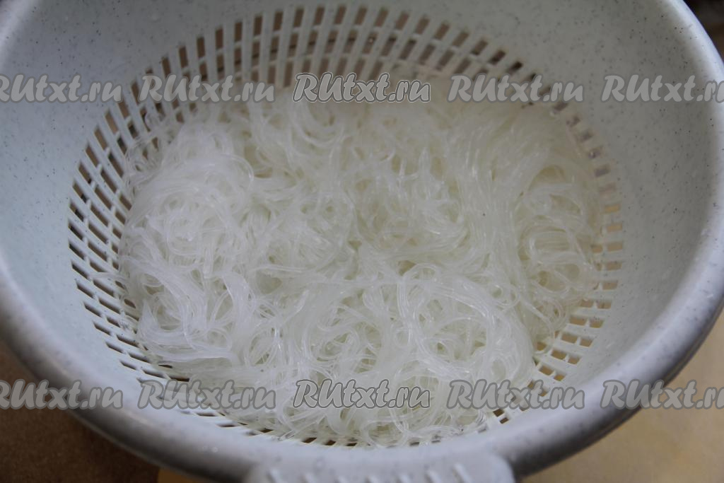 По прошествии 5 минут откинуть фунчозу на дуршлаг и промыть холодной водой. Дать лишней воде стечь с фунчозы. Разрезать фунчозу ножницами на части.