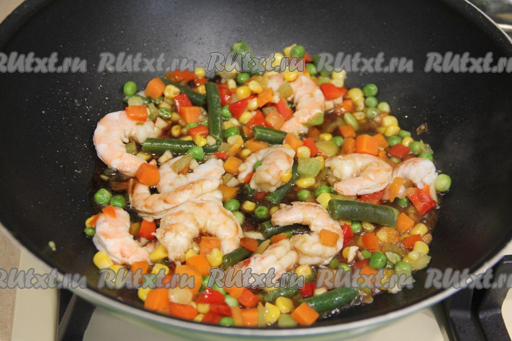 Затем выложить в сковороду очищенные креветки, перемешать и обжаривать ещё 2 минуты, периодически перемешивая.
