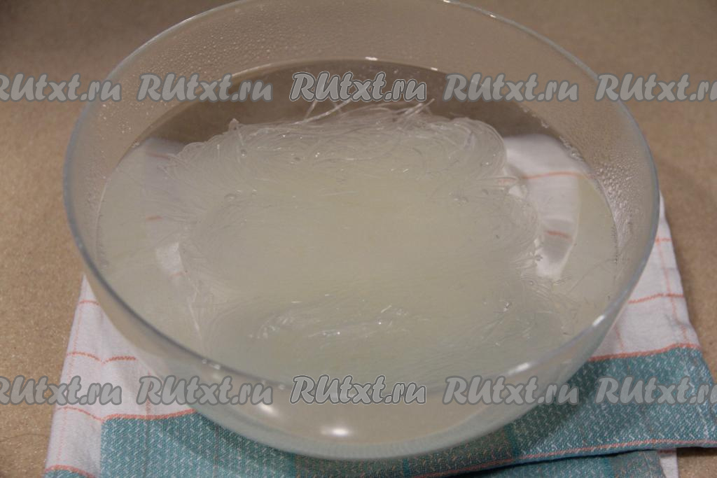 В глубокую миску выложить фунчозу, залить её кипятком и оставить на 5 минут.