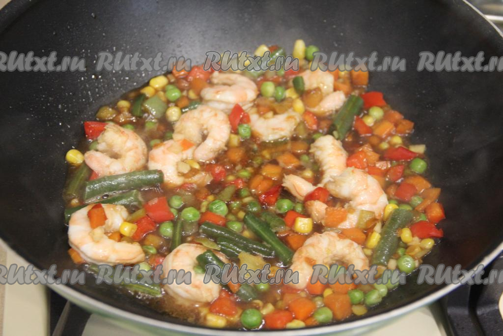 Влить соевый соус, перемешать и томить креветки с мексиканской смесью 3 минуты.