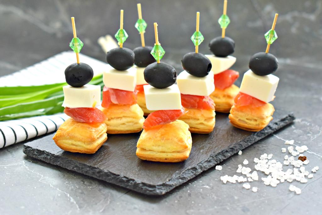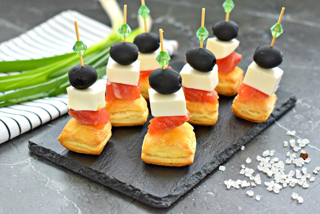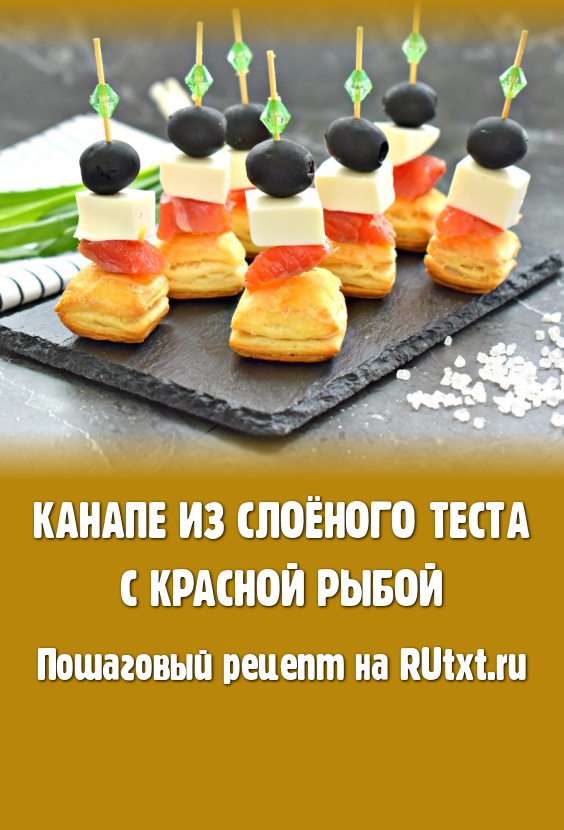 Различные порционные закуски неизменно становятся украшением любого праздничного застолья. В этот раз я предлагаю приготовить канапе из слоёного теста, красной рыбы, маслин и сыра. Слоёное тесто, предварительно нарезанное на квадратики, а затем запечённое в духовке, после остывания становится отличной основой для такой закуски. Канапе на слоёном тесте в сочетании со слабосолёной красной рыбкой отлично подходят для торжественных мероприятий, праздничных застолий, романтических ужинов.