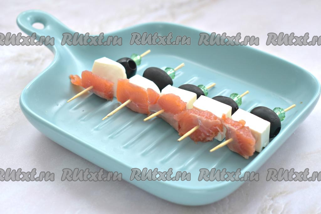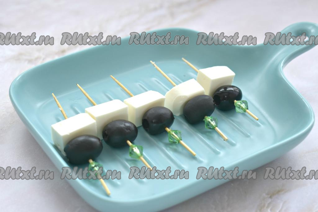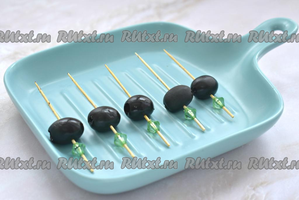 Начинаем сборку канапе. На шпажки нанизываем маслины без косточек. Кстати, вместо маслин можно взять оливки.