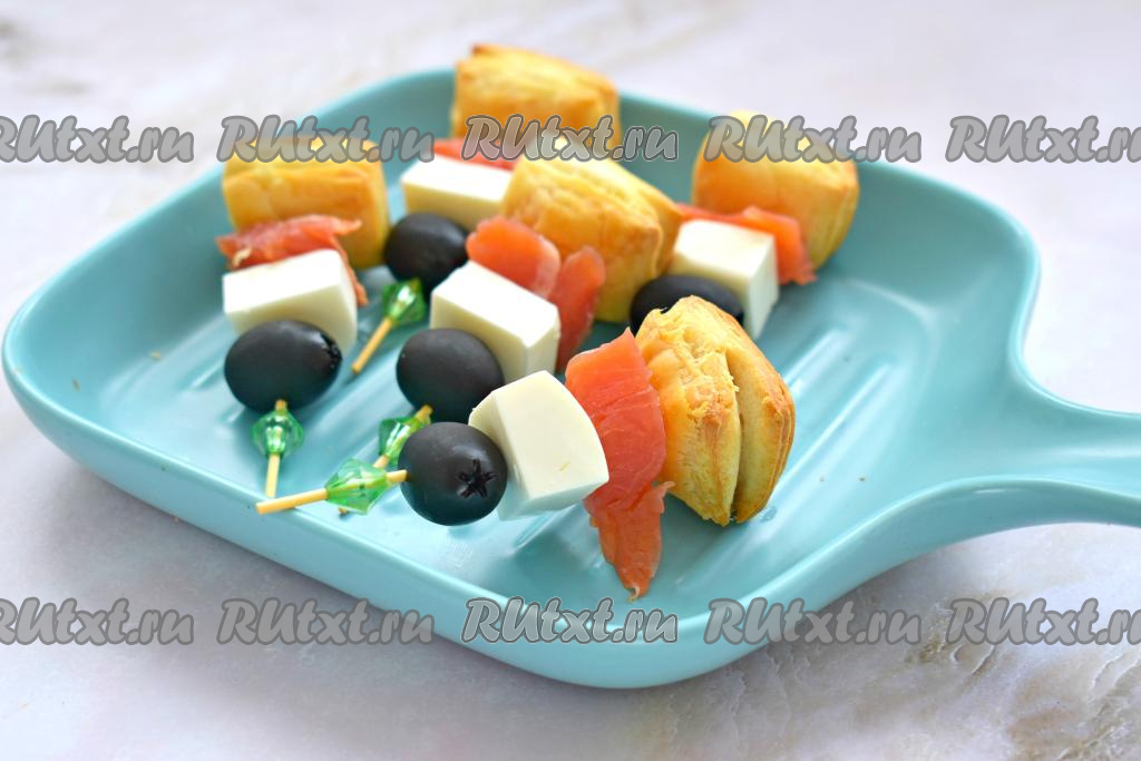 Шпажки с маслинами, сыром и рыбой вставляем в заготовки из слоёного теста. Всего получается 18 канапе из слоёного теста с красной рыбой.