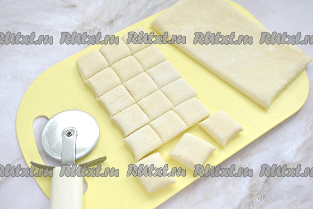 Размороженное слоёное тесто выкладываем на стол. Раскатывать тесто не нужно. Нарезаем пласт теста на квадратики со сторонами по 2,5-3 сантиметра. Из 125 грамм теста получается 18 квадратиков.