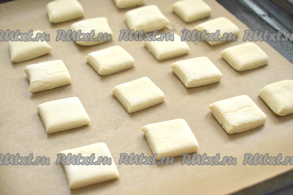 Застилаем противень пергаментом, выкладываем квадратные заготовки из теста на расстоянии друг от друга и отправляем в духовку, разогретую до 180 градусов.