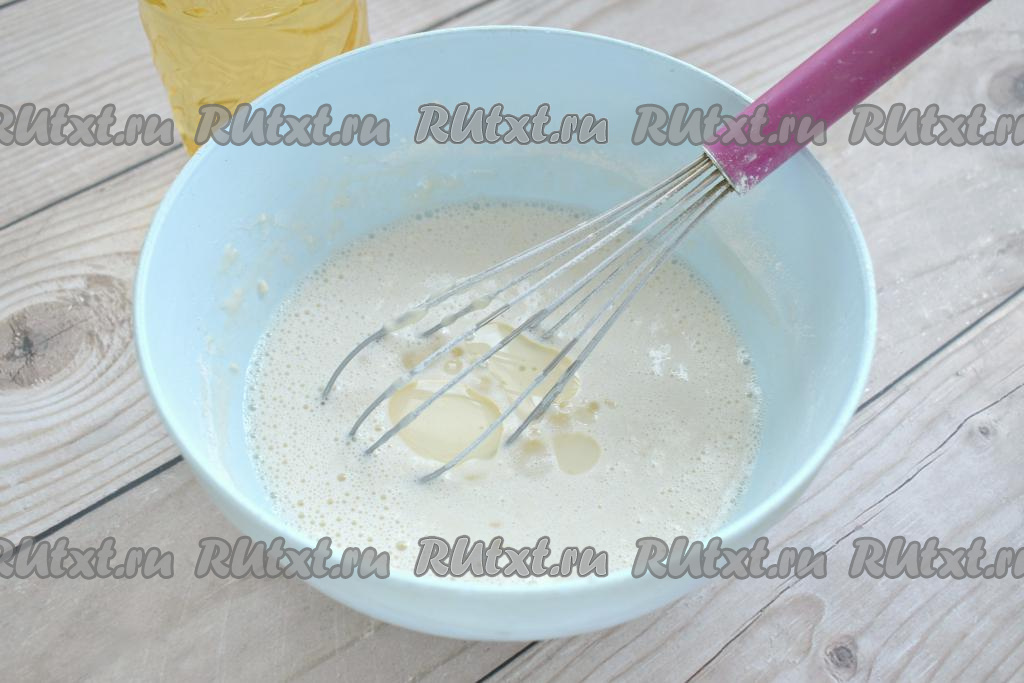В блинное тесто сразу добавляем растительное масло и хорошо перемешиваем. Готовому тесту для блинов даём постоять 10-15 минут.