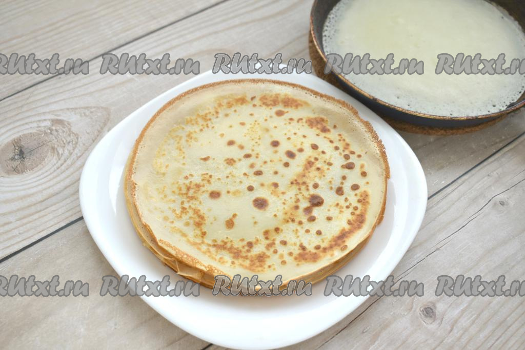 Поверхность сковороды смазываем растительным маслом и хорошо разогреваем. Выливаем на сковороду половник блинного теста, распределяя по всей поверхности. Жарим блинчик до подрумянивания с двух сторон (ориентировочно по 1 минуте с каждой стороны), затем перекладываем на тарелку. Периодически перемешивая тесто, чтобы оно не оседало, постепенно жарим блинчики из всего теста, складывая их аппетитной горочкой на тарелку. Поверхность сковороды смазываем маслом только по мере необходимости.