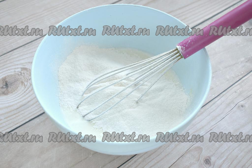 В получившуюся яичную смесь вливаем молоко комнатной температуры и снова перемешиваем венчиком.
