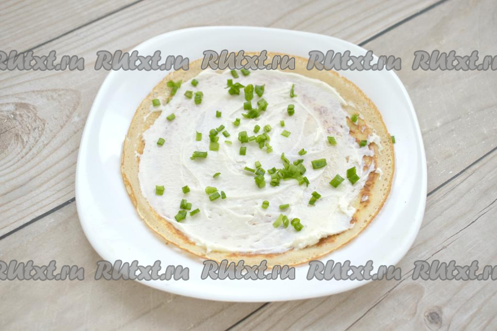 Даём блинчикам немного остыть. Зелень (я использовала зелёный лук, подойдёт также укроп или петрушка) моем, обсушиваем, нарезаем мелко. На каждый блин выкладываем примерно 2 чайных ложки творожного сыра и размазываем по всей поверхности. Сверху на творожный сыр добавляем немного нарезанной зелени.