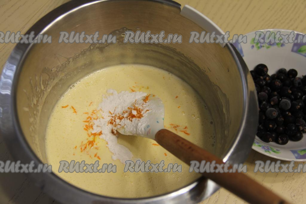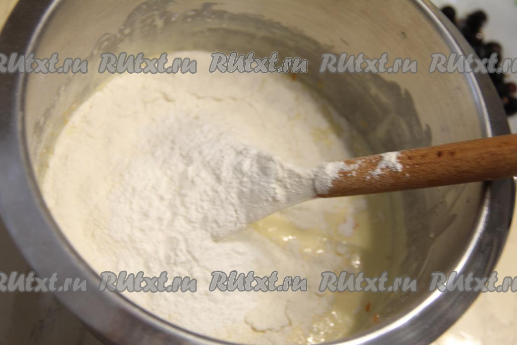 Частями добавить оставшуюся муку, каждый раз полностью вмешивая её в тесто. Добавляя муку, не забывайте учитывать густоту замешиваемого теста. Тесто должно получиться воздушным, в меру густым, напоминающим сметану средней жирности. Добавить в тесто ягоды, перемешать лопаткой.