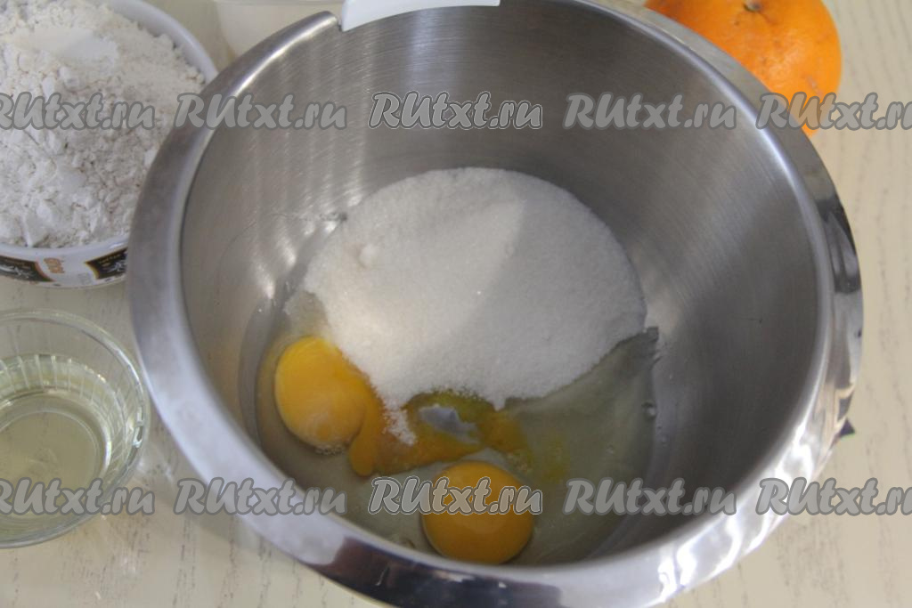 Взбить яйца с сахаром на максимальных оборотах миксера в течение 7 минут (до получения пышной и воздушной массы). Апельсин (или лимон хорошо) вымыть, обсушить, снять 1 чайную ложку цедры (снимая цедру, старайтесь не затрагивать белый слой, находящийся под ней). К яйцам, взбитым с сахаром, добавить ванильный сахар и цедру, перемешать силиконовой лопаткой, затем влить кефир и растительное масло, снова перемешать.