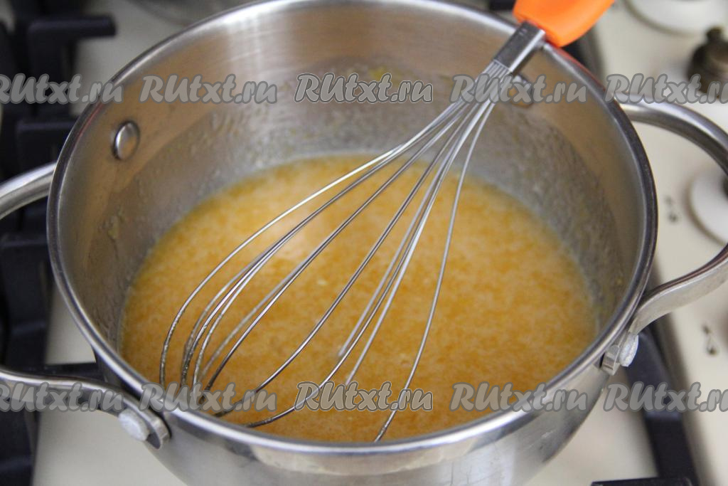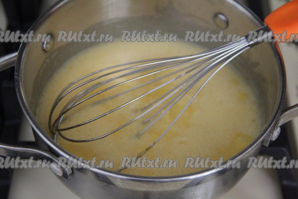 Перемешать массу венчиком и поставить кастрюлю на средний огонь.