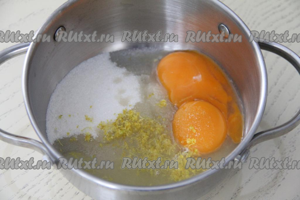 Добавить сок и цедру в кастрюлю с сахаром, желтками и крахмалом.