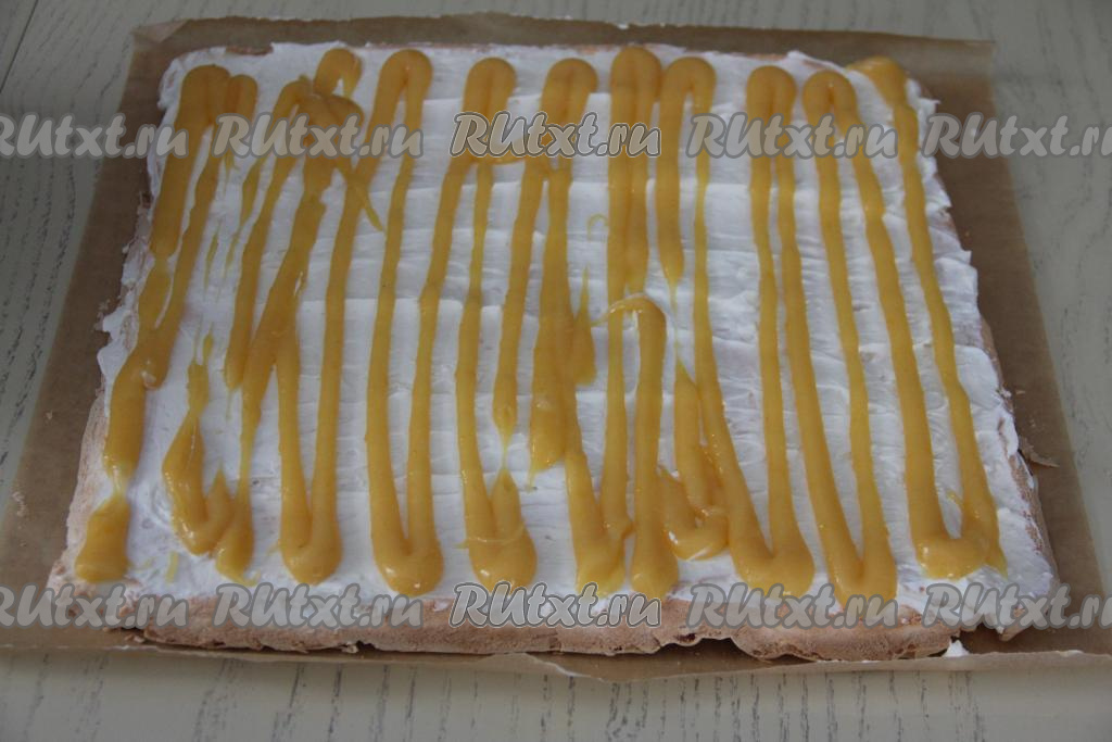 Затем нанести лимонный курд поверх крема в виде полосок. Я выложила курд в кулинарный мешок и отсадила поверх крема.