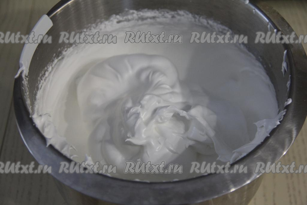 Хорошо охлаждённые белки влить в чашу миксера, добавить соль, взбить в пышную пену миксером на максимальных оборотах. Затем, продолжая взбивать, добавить сахар и лимонную кислоту. Взбивать белки в течение 10 минут (до крепких пиков).