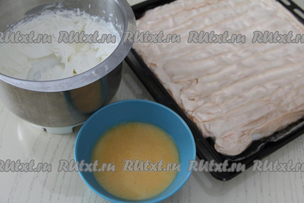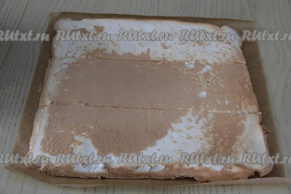 Выпекать безе (меренгу) при температуре 180 градусов примерно 20 минут. Поверхность должна стать слегка хрупкой. Готовый корж достать из духовки, дать слегка остыть, перевернуть на чистый лист пергамента, снять коврик (или пергамент), на котором он выпекался, и оставить до полного остывания. Остывший меренговый корж разрезать на 3 равные части.