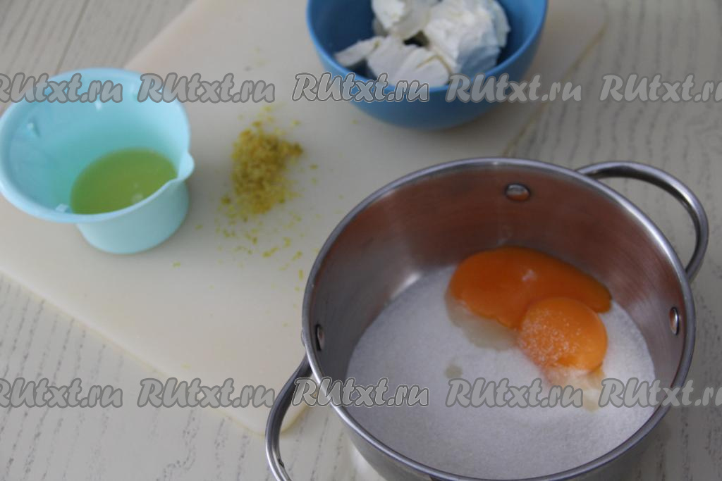 Прежде всего нужно приготовить лимонный курд, чтобы он полностью остыл и стабилизировался. Подготовить для курда все продукты. Сливочное масло должно быть комнатной температуры, поэтому заранее достаньте его из холодильника. Взять 2 яйца, очень аккуратно разделить на белки и желтки (в белки не должно попасть ни капли желтка). Белки пока отправить в холодильник. А 2 желтка пригодятся нам для курда. Лимон тщательно вымыть, так как в дальнейшем мы будем снимать с него цедру.