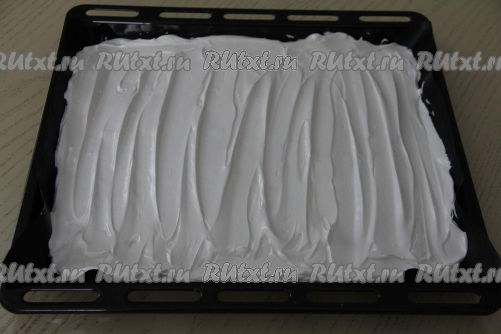 Выложить белковую массу на противень (я выпекала на противне размером 31 сантиметр на 33 сантиметра), застеленный тефлоновым ковриком для выпечки. Разровнять белковую массу лопаткой, поставить противень в хорошо разогретую духовку.