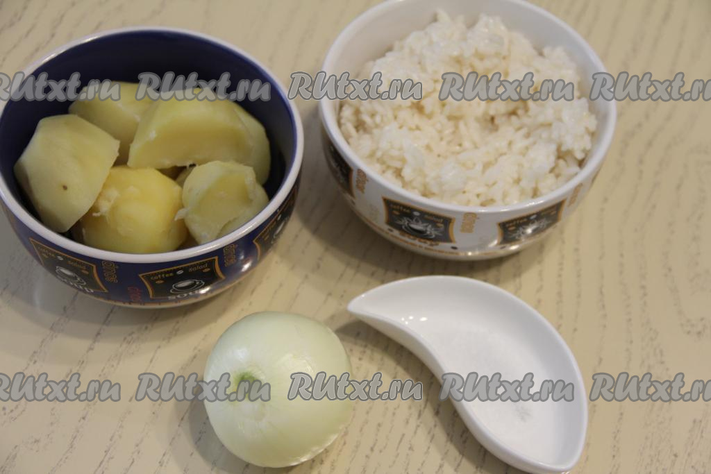 Очищенный картофель выложить в кастрюлю, залить полностью водой, подсолить и отварить до готовности (в течение минут 20-25 после закипания воды), затем воду слить и дать картошке немного остыть. Рис промыть проточной водой, затем выложить в кастрюлю с кипящей подсоленной водой, перемешать, а после закипания варить на небольшом огне до готовности (минут 20-25, рисинки должны стать мягкими). Откинуть сварившийся рис на дуршлаг, чтобы стекла лишняя вода, дать немного остыть. Лук почистить. При желании можно взять рис и картошку, оставшиеся от обеда или ужина.
