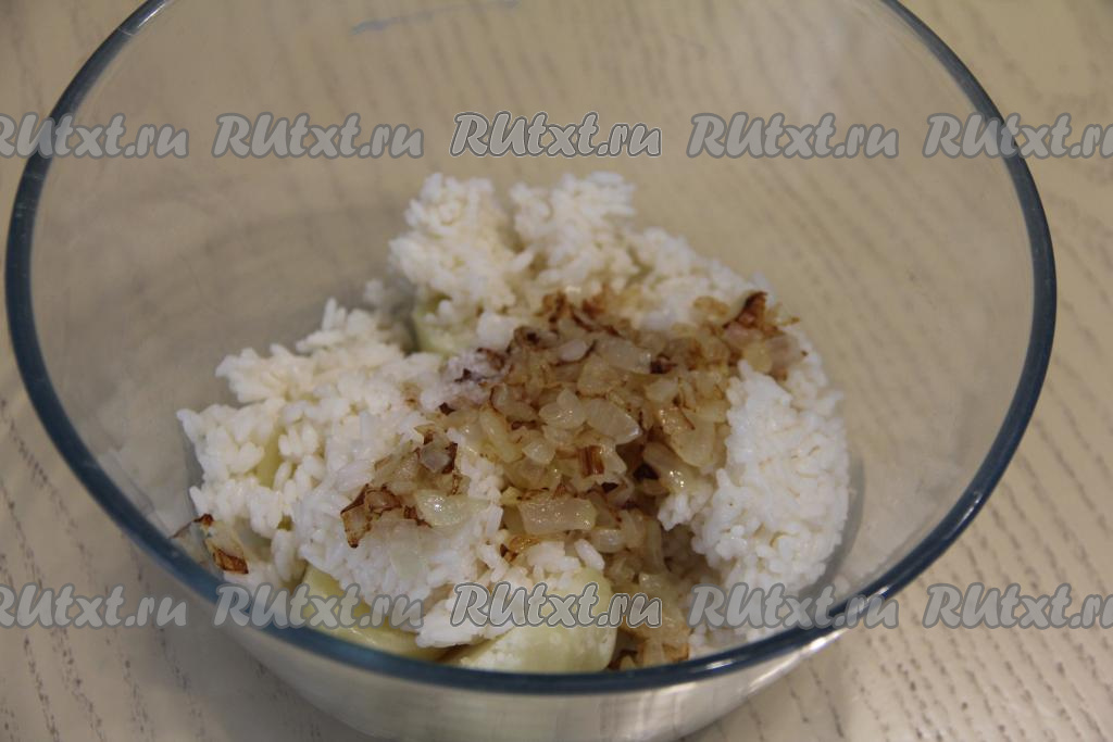 В глубокой миске соединить картошку, рис и жареный лук.