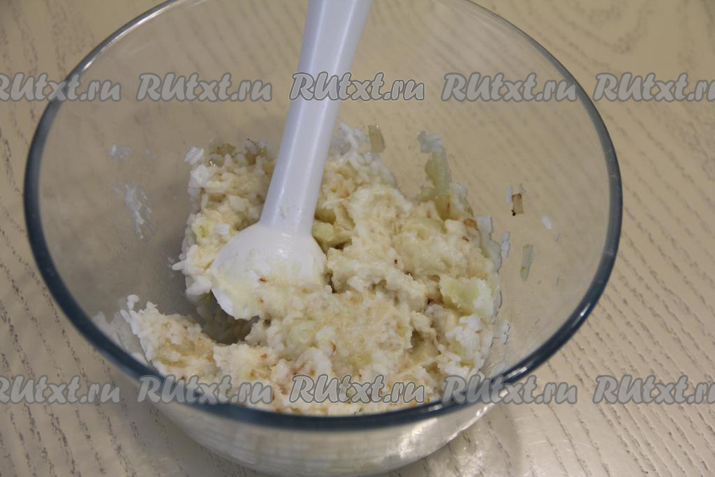 Пробить массу погружным блендером (или пропустить через мясорубку). Попробовать на вкус, если нужно, подсолить и тщательно перемешать. При желании в получившуюся рисово-картофельную массу можно добавить мелко нарезанную свежую зелень.