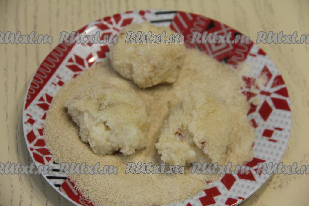 Разделить рисово-картофельную массу на равные части (я разделила на 10 частей). Влажными руками взять 1 часть получившейся массы, обвалять со всех сторон в панировочных сухарях, формируя круглую котлету. Таким образом сформировать и обвалять в сухарях все 10 постных котлет из риса и картошки.