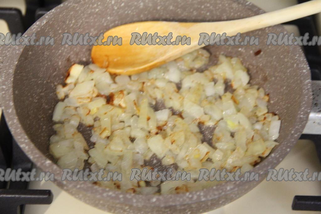 Разогреть в сковороде растительное масло, выложить лук и обжарить его на среднем огне до лёгкой золотистости (в течение минут 5), иногда помешивая.