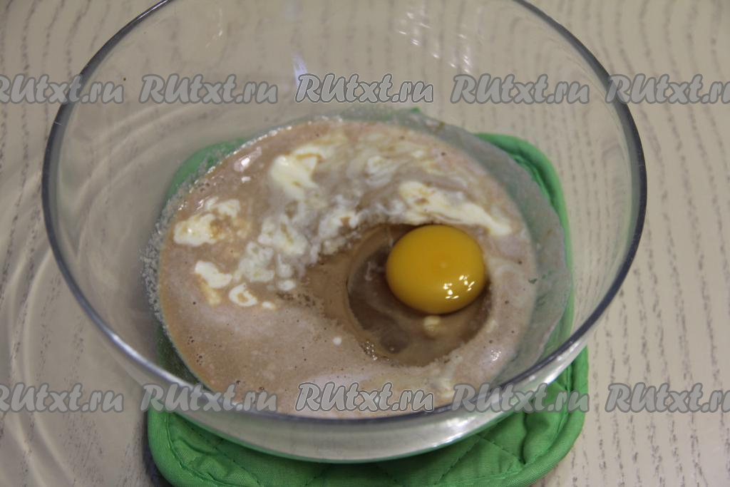 Добавить сырое яйцо. Перемешать кофейно-дрожжевую массу венчиком до однородности.