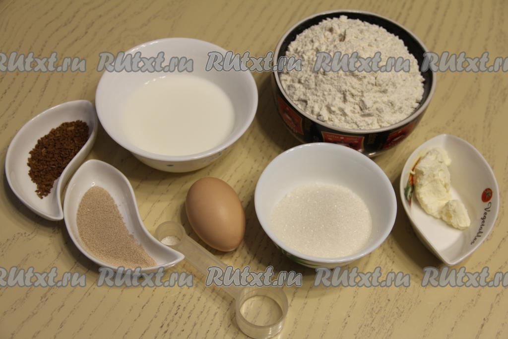 Молоко подогреть до 40 градусов, влить в глубокую тарелку, добавить дрожжи и 1 чайную ложку сахара (сахар берётся из общего количества сахара, указанного в ингредиентах), хорошо перемешать и оставить опару в тёплом месте на 15 минут. В отдельной ёмкости 1 чайную ложку растворимого кофе растворить в 1 столовой ложке горячей воды, дать остыть до комнатной температуры. Сливочное масло растопить в микроволновке (или на плите), дать немного остыть.