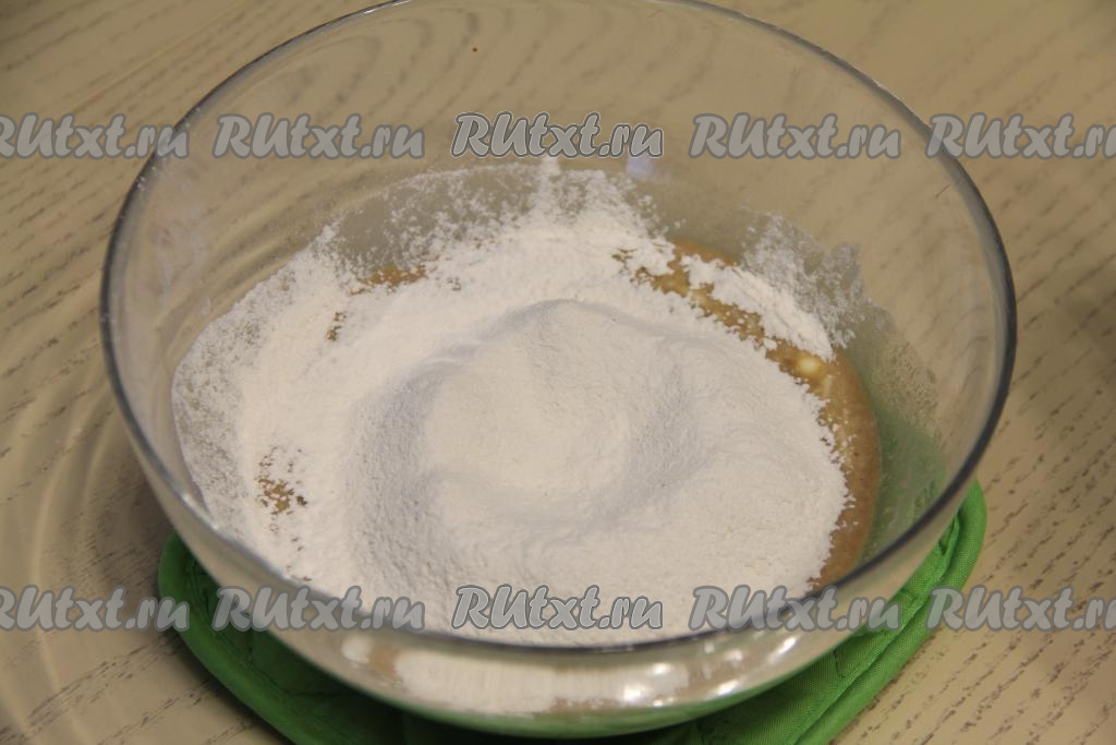 Просеять в отдельную ёмкость муку. Всыпать половину просеянной муки в миску с кофейно-дрожжевой массой, перемешать тесто лопаткой (или столовой ложкой) до однородности. Затем частями всыпать оставшуюся муку, замешивая тесто руками.