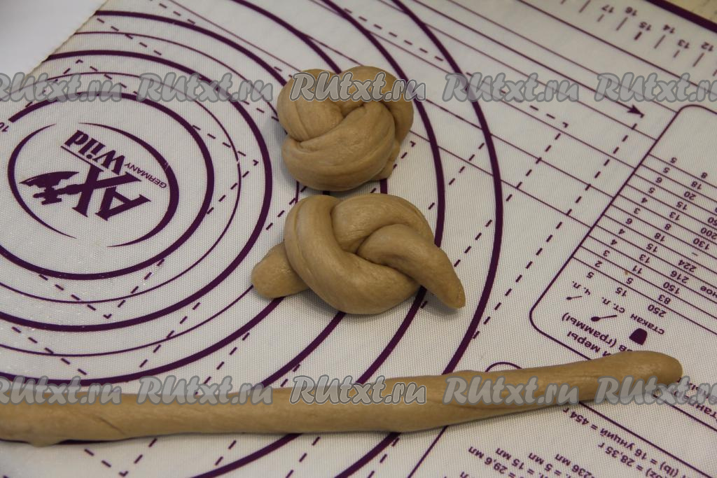 Поднявшееся тесто обмять, разделить на 8 частей. Сформировать булочки любой формы, можно просто круглые. Я каждую часть теста раскатала в жгутик длиной примерно 13 сантиметров и завязала простой узелок, затем кончики жгутика подвернула под низ кофейной булочки.