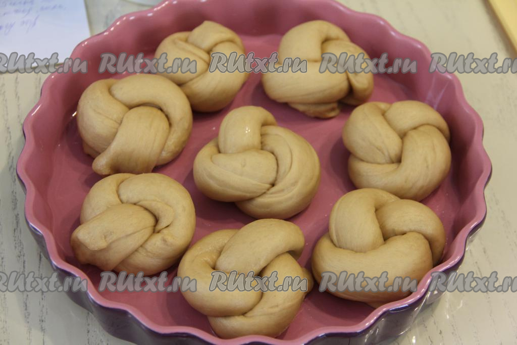 Выложить булочки на небольшом расстоянии друг от друга в жаропрочную форму, смазанную маслом (или на противень, застеленный пергаментом), и оставить для расстойки в тёплом месте на 35-40 минут.