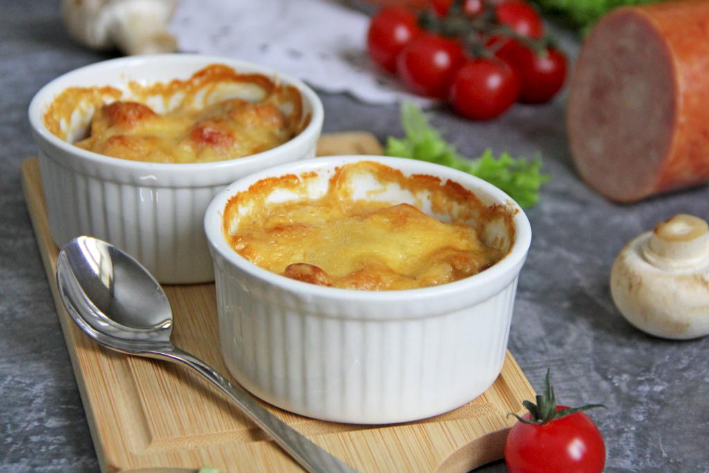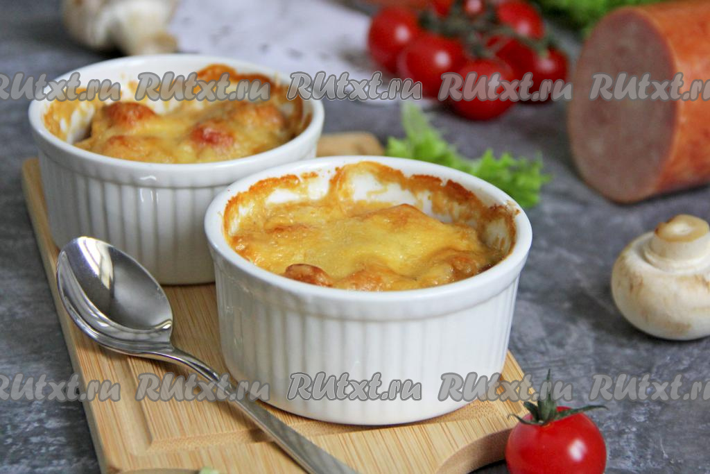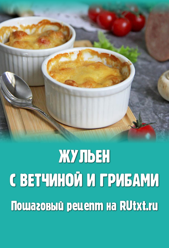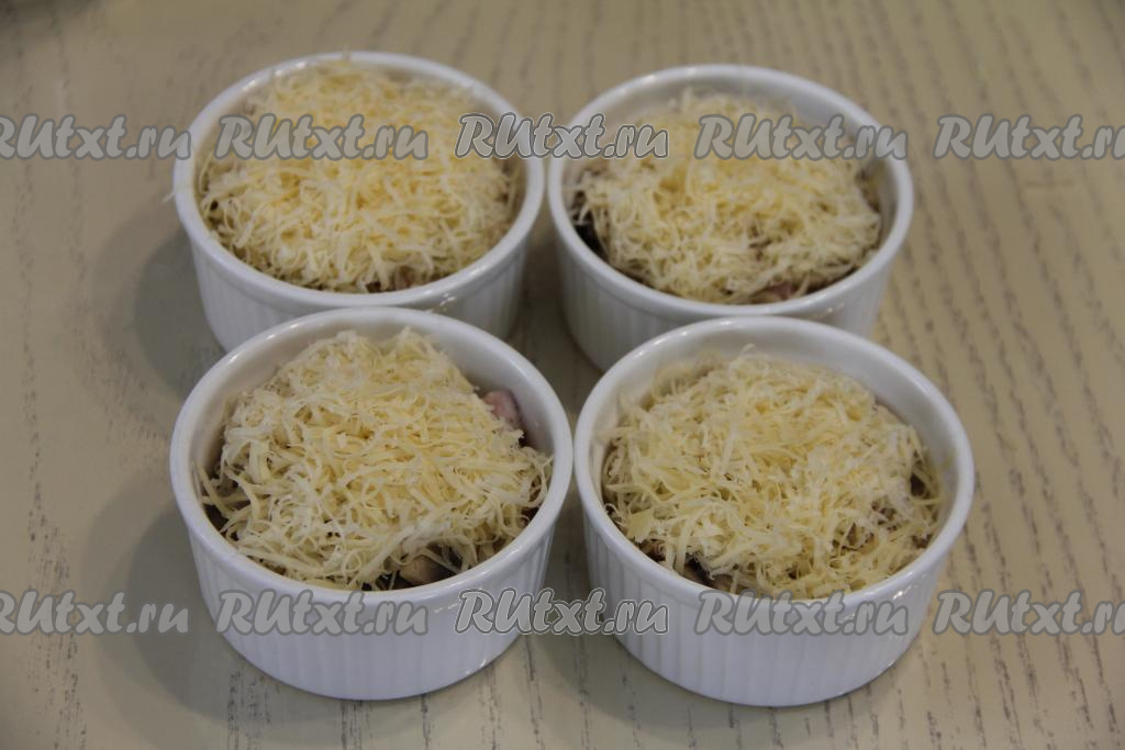 Сверху грибы с ветчиной посыпать сыром, натёртым на средней тёрке, и отправить кокотницы с жульеном в разогретую духовку.