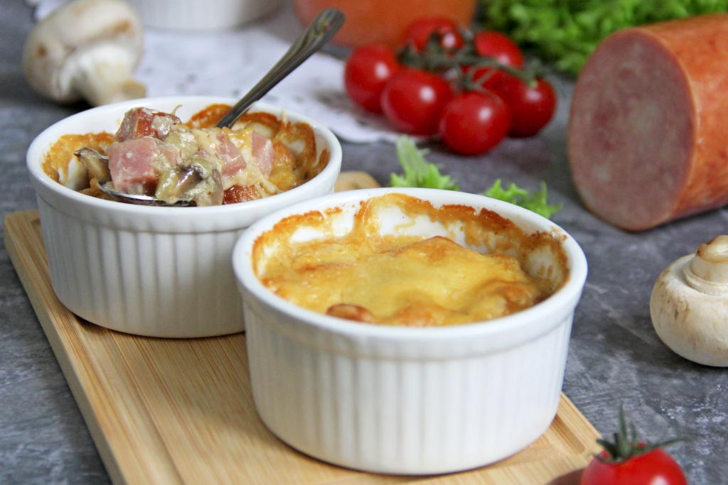 Вкуснейший, ароматный, сочный жульен, приготовленный с ветчиной и грибами, подать к столу в горячем виде.