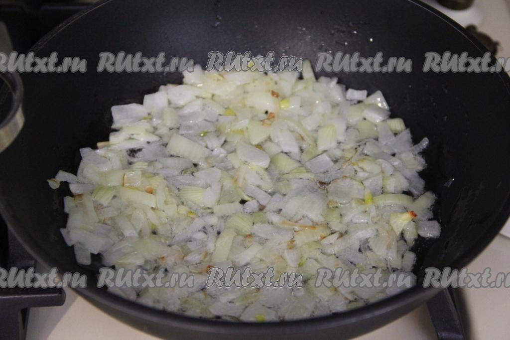 В сковороду влить растительное масло, разогреть его. Лук мелко нарезать, добавить в сковороду и обжаривать его 4-5 минут (до прозрачности), периодически помешивая, на среднем огне.
