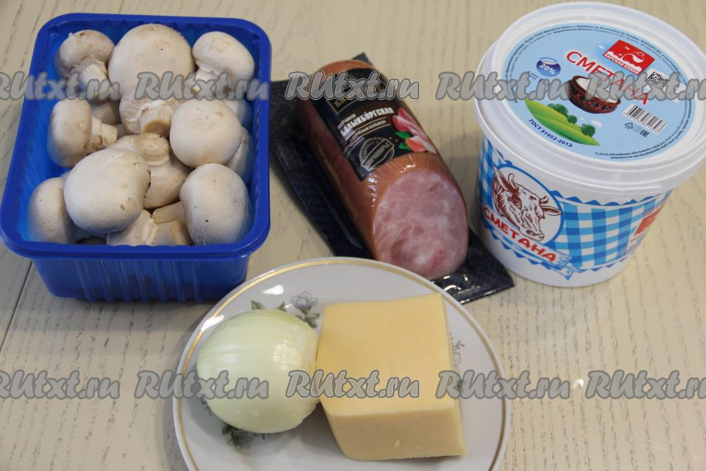 Подготовить продукты. Шампиньоны промыть водой. Лук почистить.