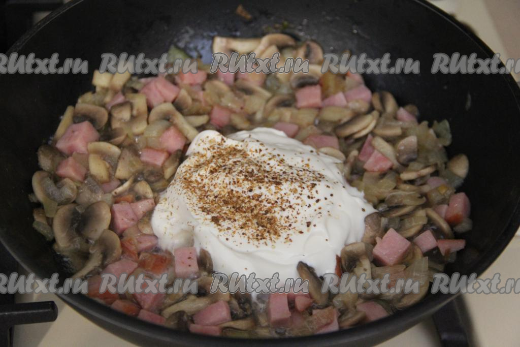Обжаривать грибы с ветчиной 2-3 минуты, иногда помешивая, затем добавить сметану, соль, специи.