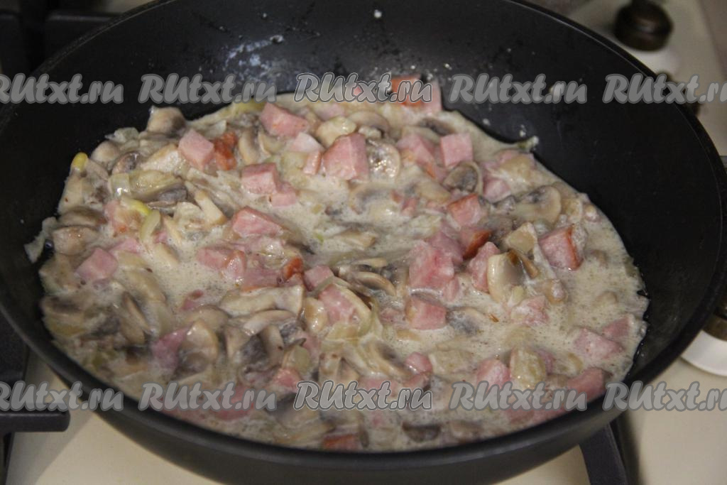 Перемешать грибы с ветчиной и сметаной, потомить 2-3 минуты на медленном огне.