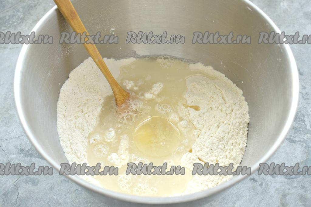 Следом вливаем кипячёную воду комнатной температуры и сразу добавляем растительное масло.