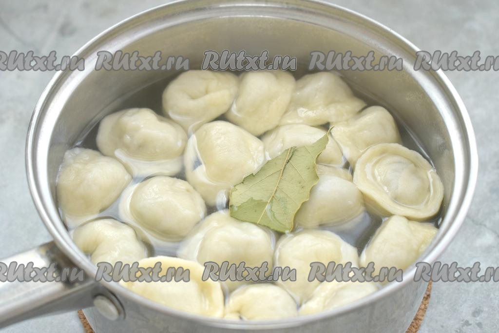Часть пельменей я поместила в кастрюлю с кипящей подсоленной водой, добавила лавровый лист и варила на среднем огне с момента всплытия пельмешек на поверхность примерно 6-7 минут.