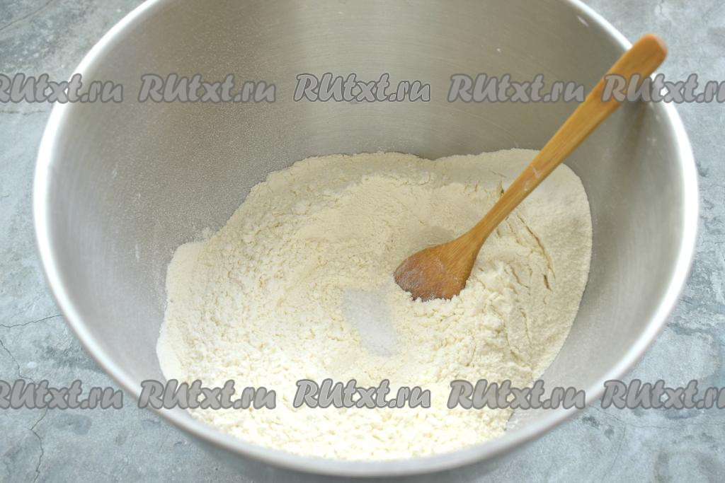 Приготовление домашних пельменей начнём с замешивания теста. Для этого в глубокую миску просеиваем 3 стакана муки, затем всыпаем соль и перемешиваем лопаткой (или ложкой), образуя в центре воронку.