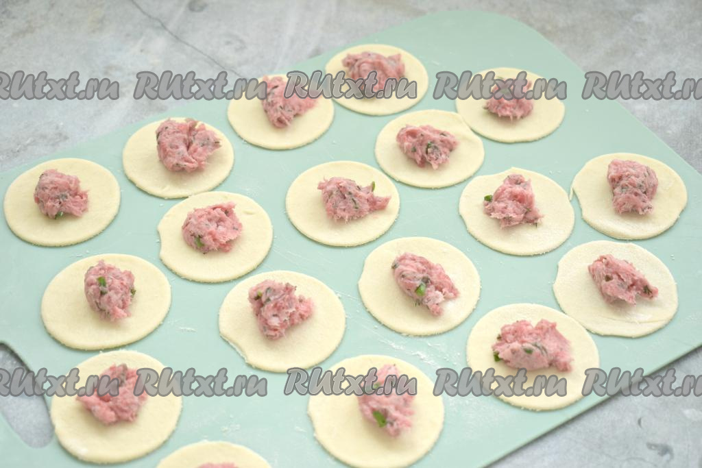 На каждую круглую заготовку выкладываем чуть меньше чайной ложки фарша.