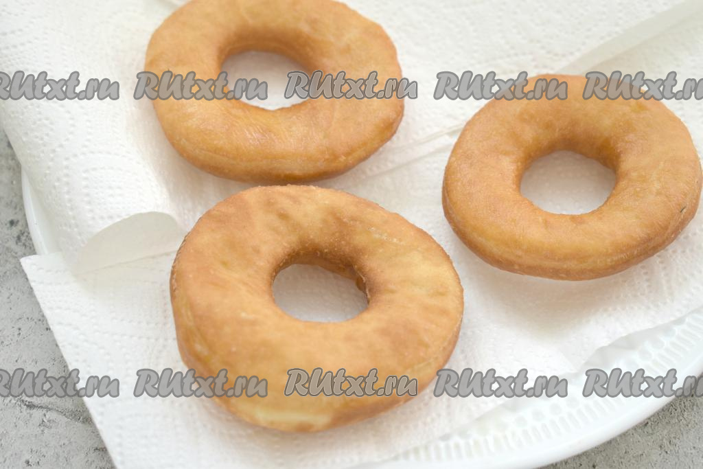 Достаём пончики из масла с помощью вилок (или шумовки) и выкладываем на бумажные полотенца, чтобы избавиться от лишнего жира. Постепенно жарим все дрожжевые постные пончики.