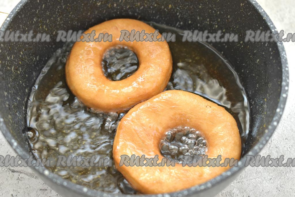 В подходящей посуде (глубокой сковороде, сотейнике, казане) сильно разогреваем достаточно большое количество растительного масла, уменьшаем огонь до среднего. Аккуратно выкладываем в горячее масло несколько заготовок пончиков. Обжариваем пончики с каждой стороны примерно по 1,5 минуты (до золотистости с каждой стороны).