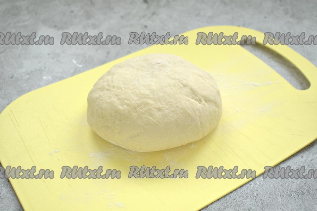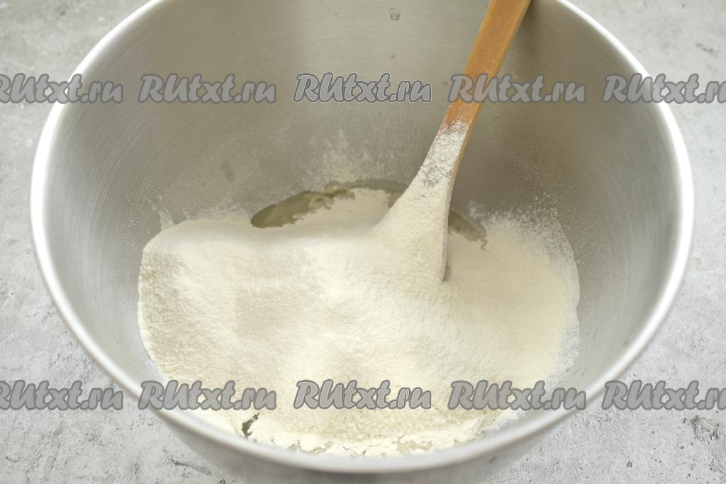 В получившуюся смесь просеиваем половину муки, перемешиваем лопаткой. Частями всыпая оставшуюся просеянную муку, перемешиваем тесто вначале лопаткой, а после того как оно начнёт собираться в ком, вымешиваем его руками в течение 7-10 минут, добавляя понемногу муку только по мере необходимости.
