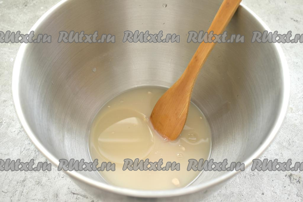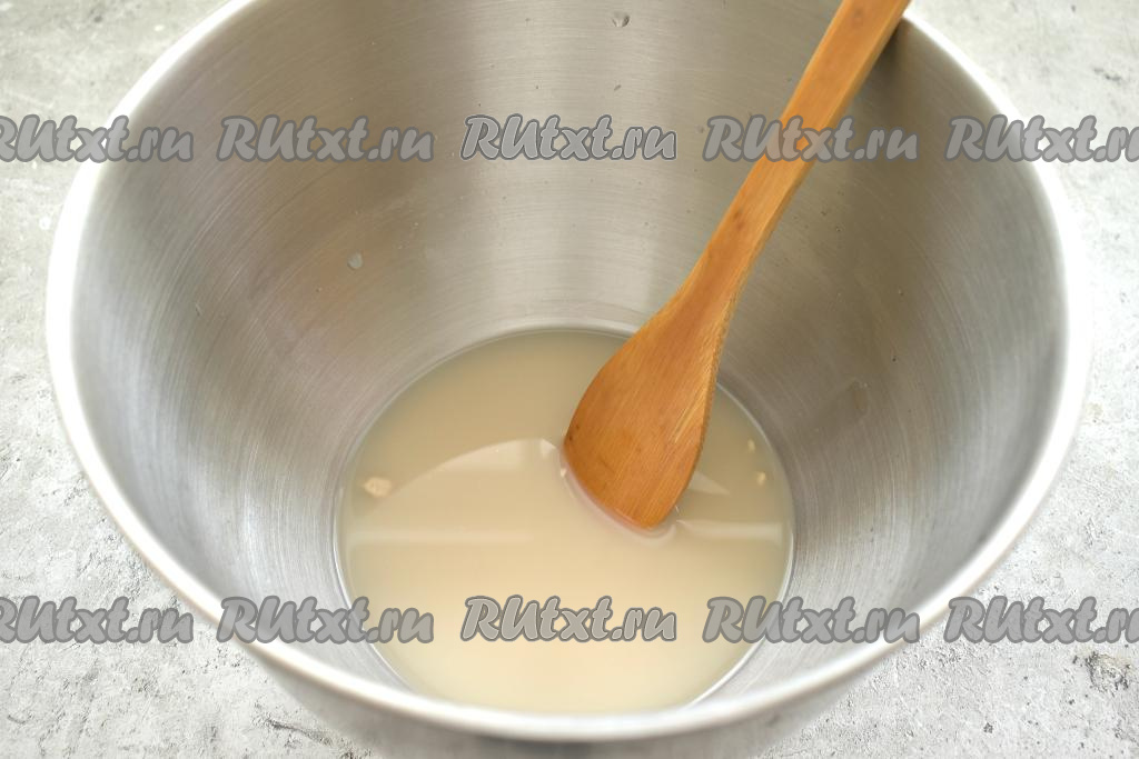 Вливаем тёплую воду (примерная температура воды 38-39 градусов), хорошо перемешиваем, чтобы дрожжи полностью растворились.